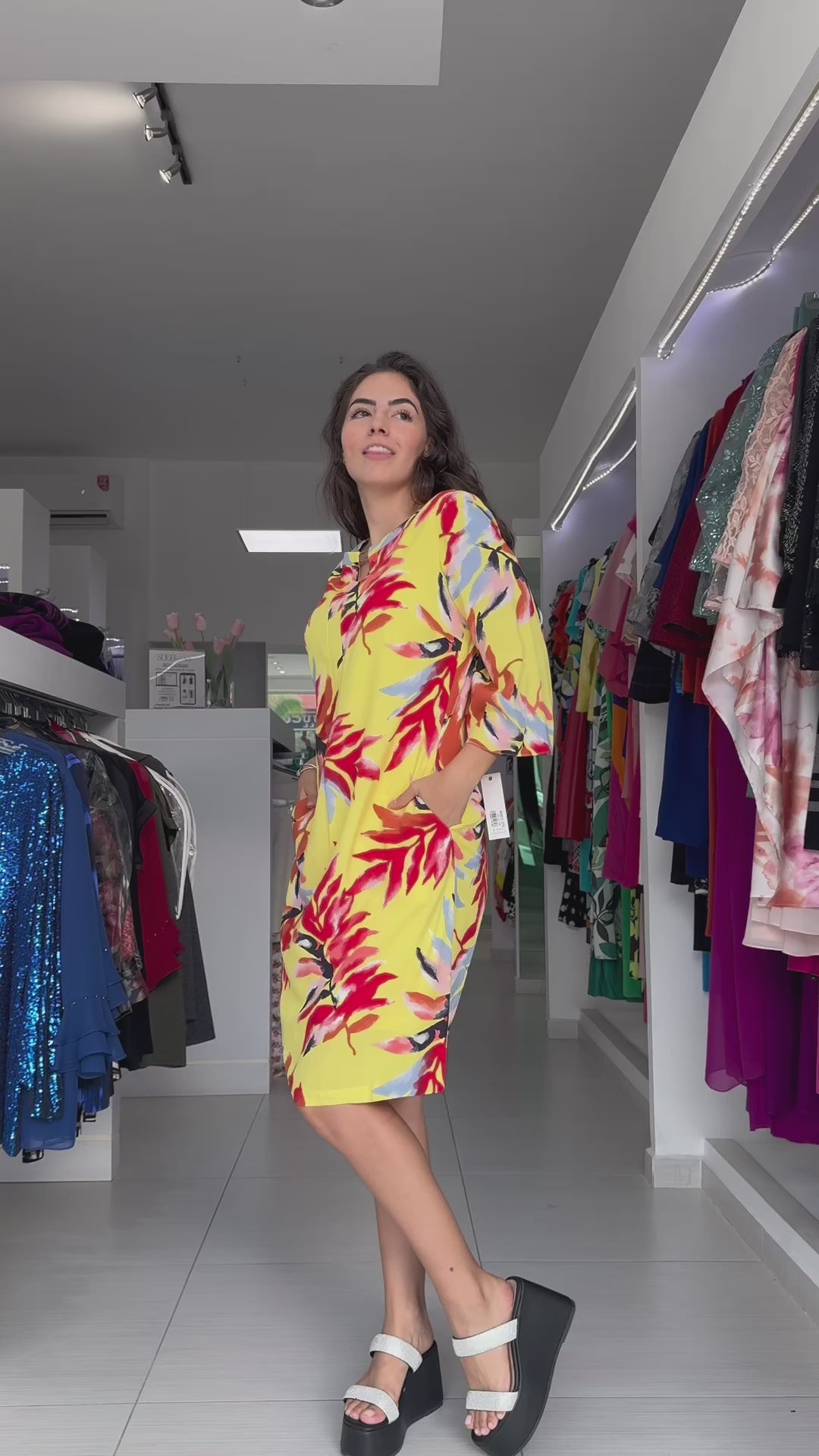 Vestido corto amarillo con estampado de flores rojas, manga 3/4, escote v